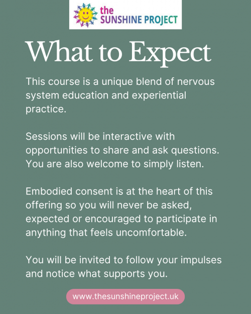 Embodied choice is at the heart of this offering so you will never be asked, expected or encouraged to participate in anything that feels uncomfortable to your nervous system.